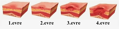 4 evre: Derinin tüm tabakaları etkilenmiştir, kas ve kemik dokuda harabiyet vardır. Yara genellikle enfektedir, ağrı hissedilmez.